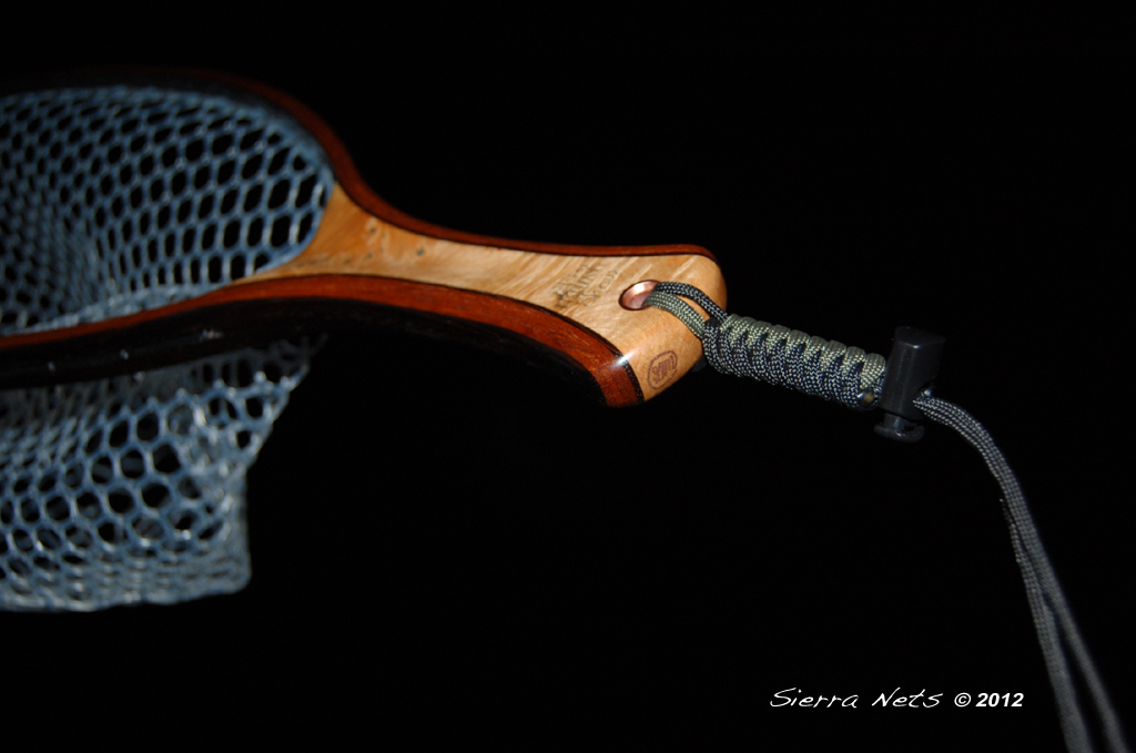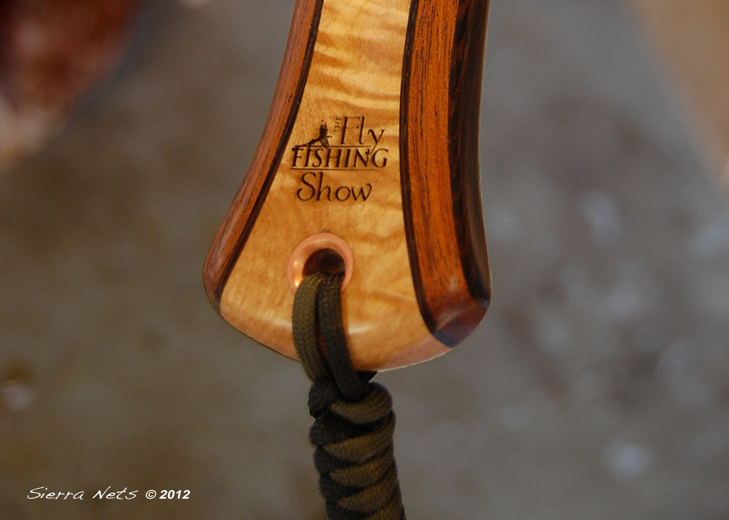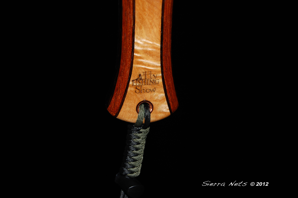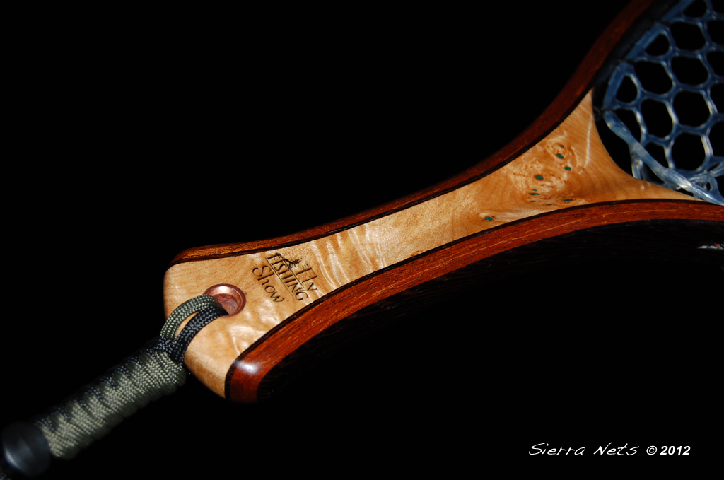 This one-of-a-kind Cat's Paw Burl Maple net was created for the owners of the Fly Fishing Shows which travel around the country every spring. It has their logo prominently lasered into the handle. Wenge and Mahogany create the hoop, and copper and turquoise inlays adorn the wood.