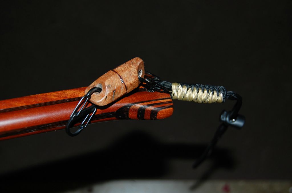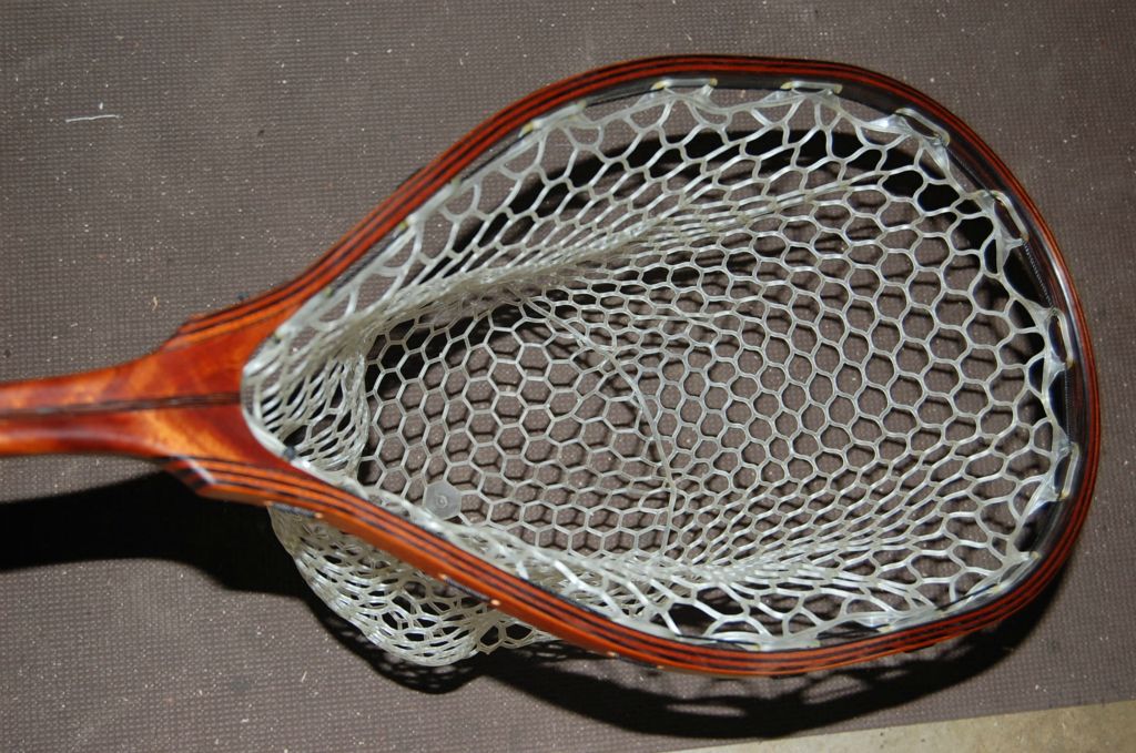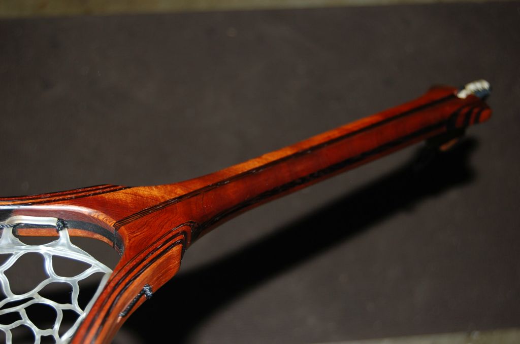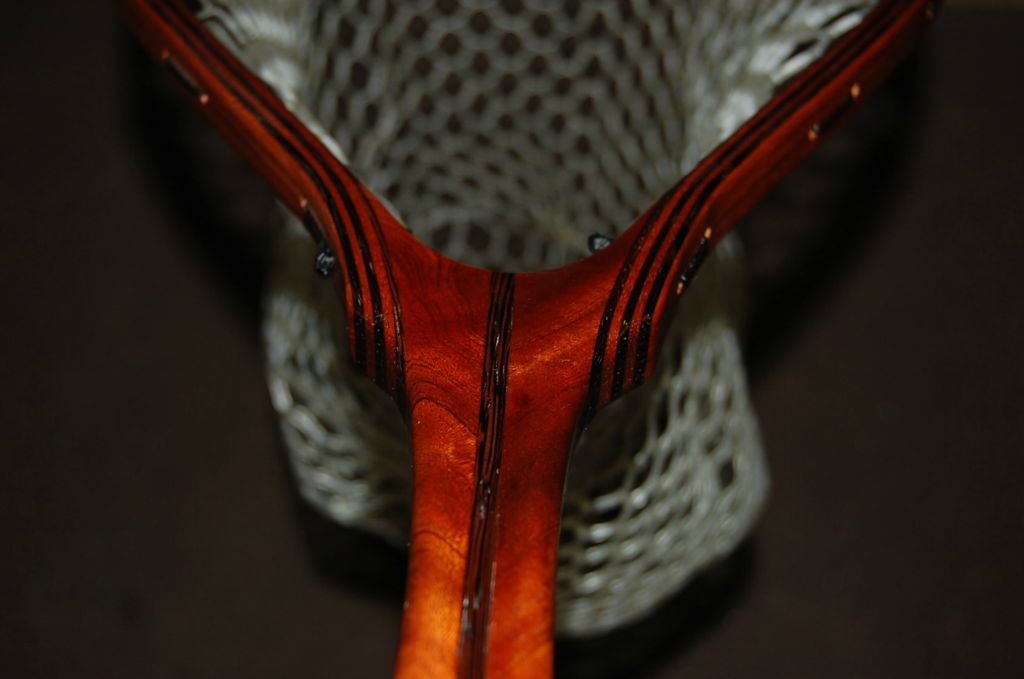 Stripes, stripes, and more stripes! This fantastic Custom Fly Fishing net features a figured Mahogany & Wenge handle with alternating strips of Mahogany & Wenge. Photograph 4 shows a custom Oak Burl External Magnetic Catch.