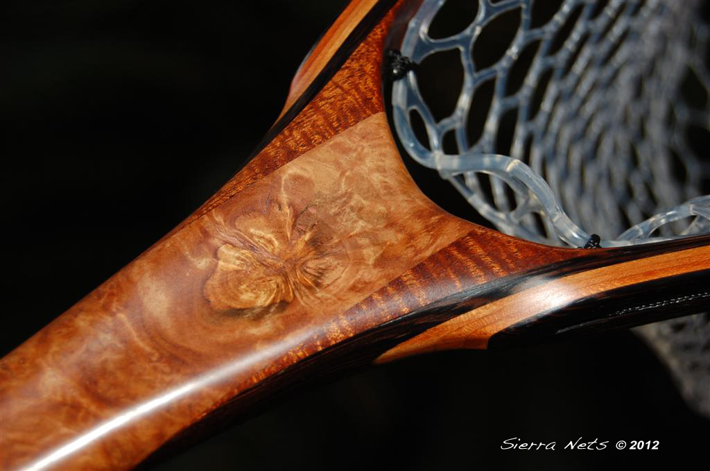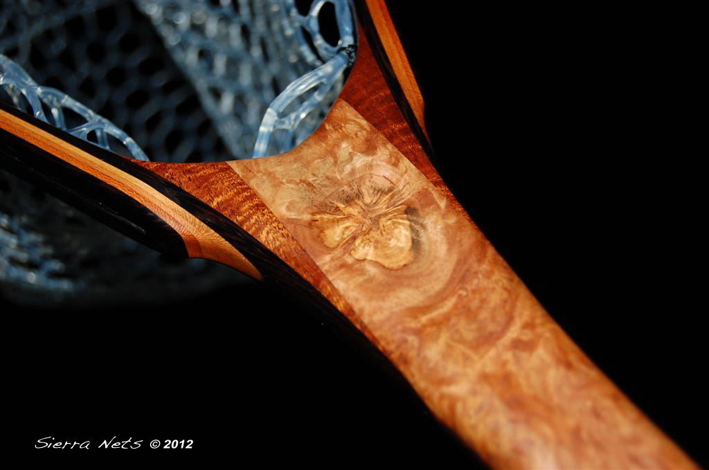 This handsome looking net is the second of three for a Colorado client. This one was a gift to fish fly fishing partner who also happens to be his brother. It features a prominent knot in the center of the net. This draws the eye in and starts one looking at the amazing swirls of grain in this Eucalyptus burl. Rare curly mahogany flanks the burl and Wenge and Cherry round out the rich hoop woods.
