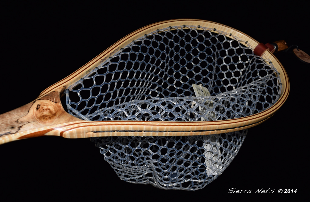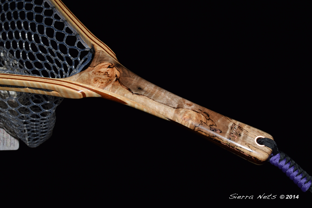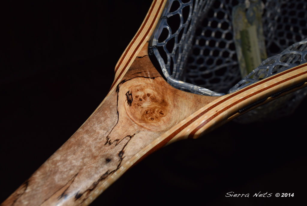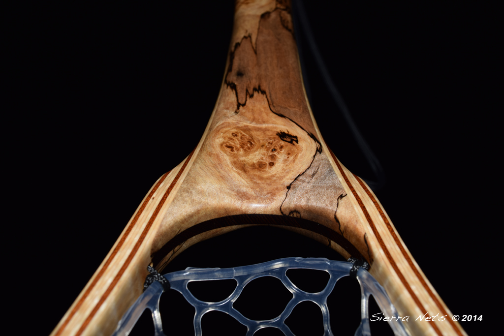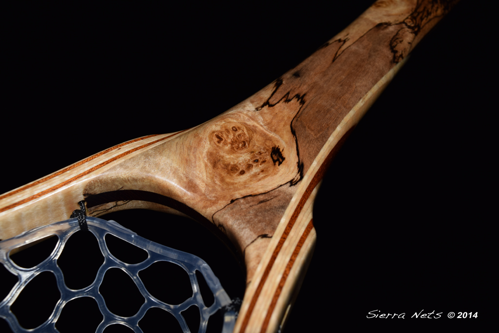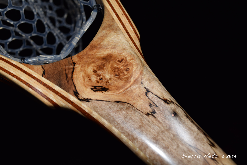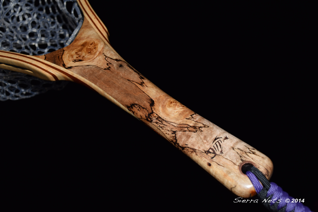 This stabilized Spalted Maple Burl net is from the last of a spectacularly figured board I acquired. There are over 20 man hours into creating it. The small burl clusters you see are interspersed with curly figure and black spalt lines. The hoop woods are made of Curly Maple & Salvaged Mahogany. Copper accents the net-Used in the inlays and the lanyard ferrule.