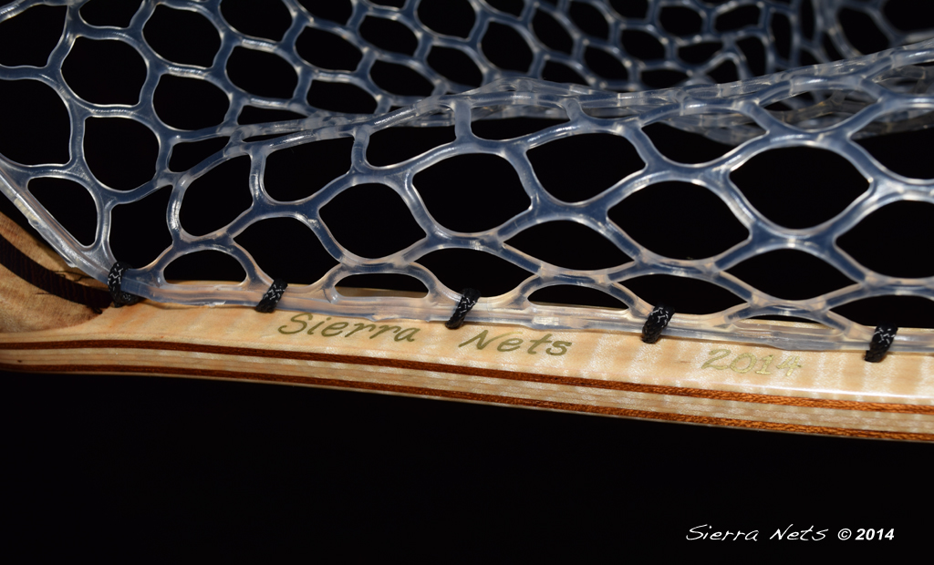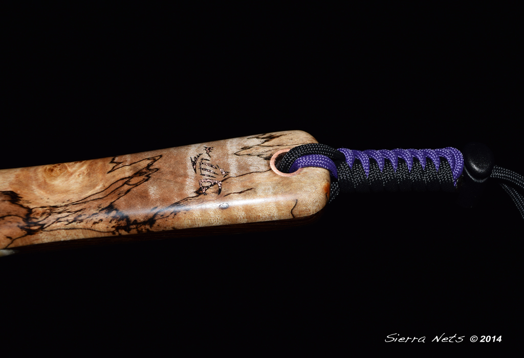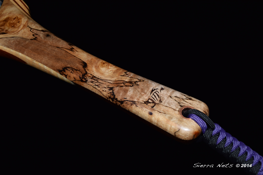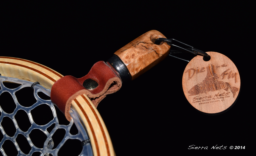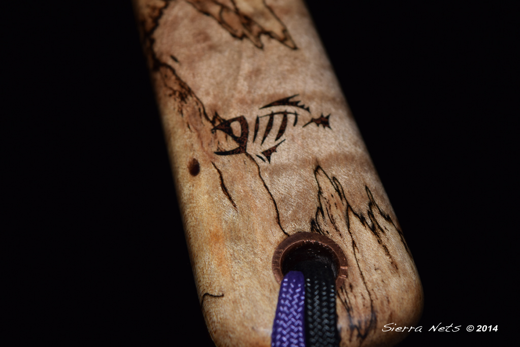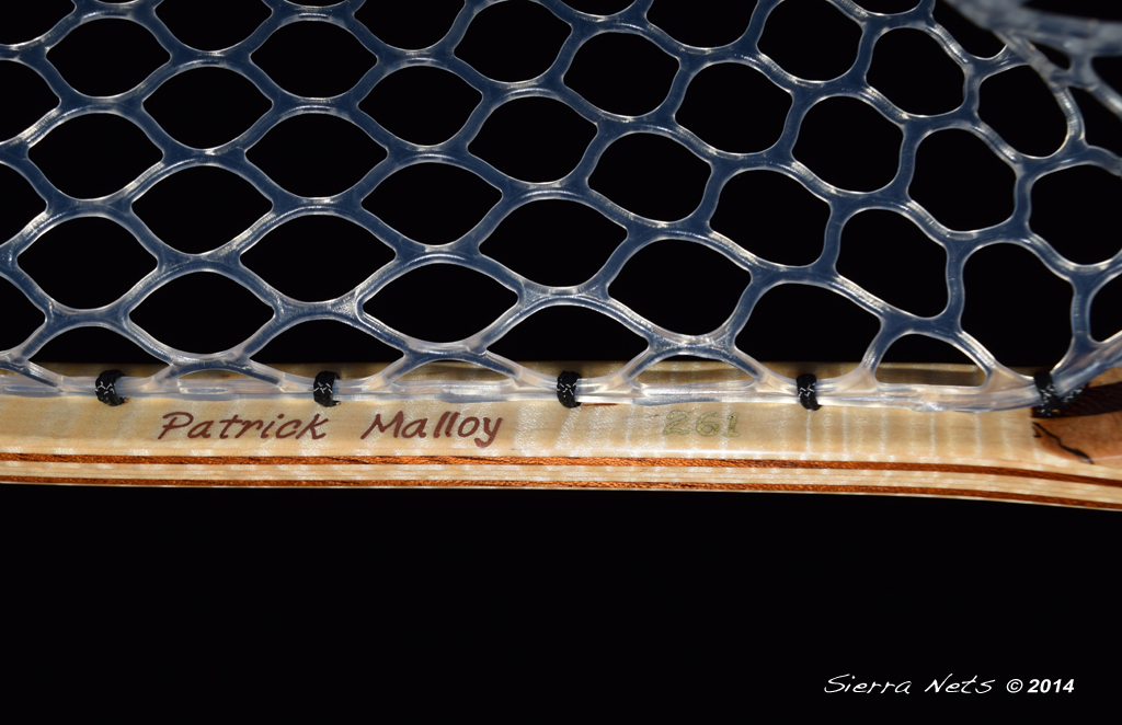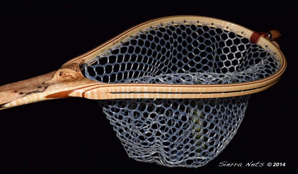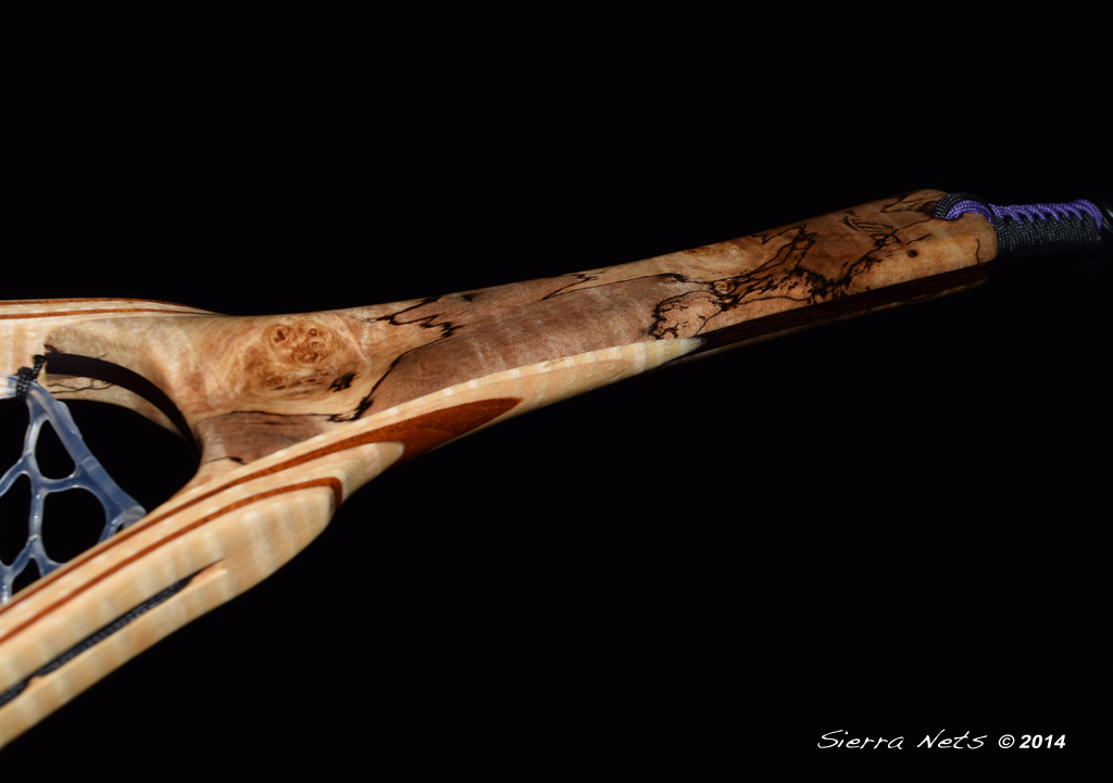 This stabilized Spalted Maple Burl net is from the last of a spectacularly figured board I acquired. There are over 20 man hours into creating it. The small burl clusters you see are interspersed with curly figure and black spalt lines. The hoop woods are made of Curly Maple & Salvaged Mahogany. Copper accents the net-Used in the inlays and the lanyard ferrule.