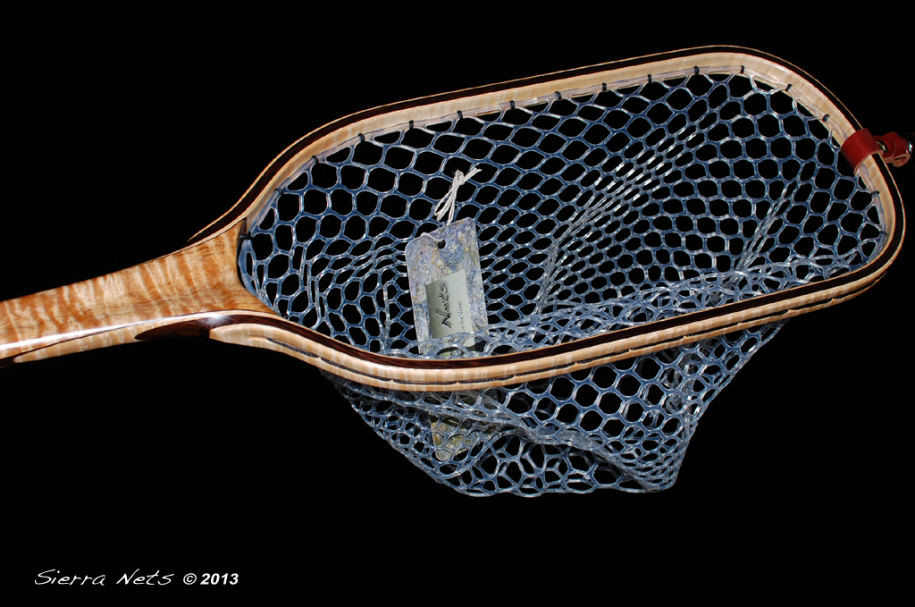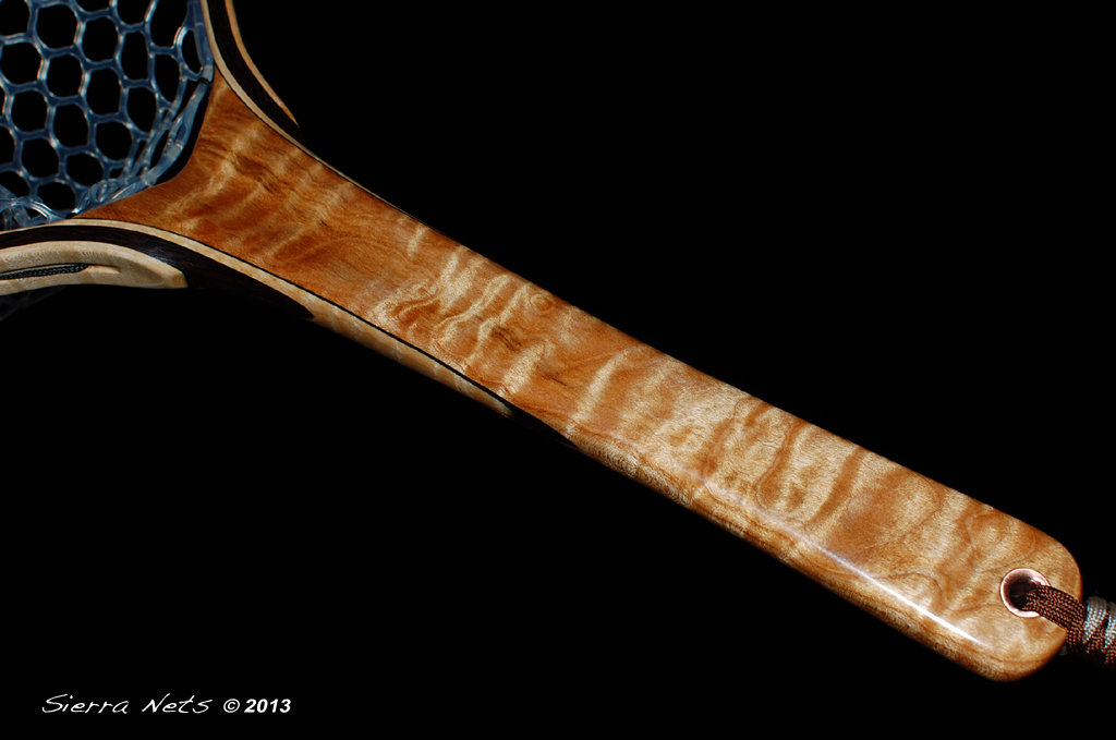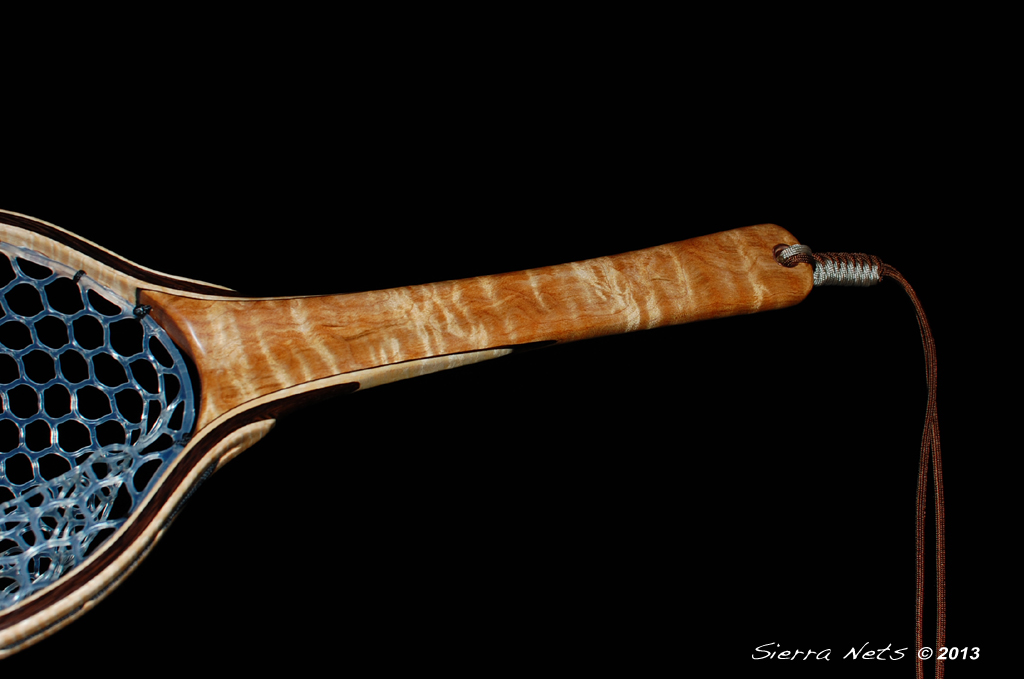 This is another example of client/artist collaboration. The client bought a very nice piece of figured maple, and drop shipped it to me. I created a C&R style net for him using his handle wood. He fancied Claro Walnut burl for his magnetic net release.
