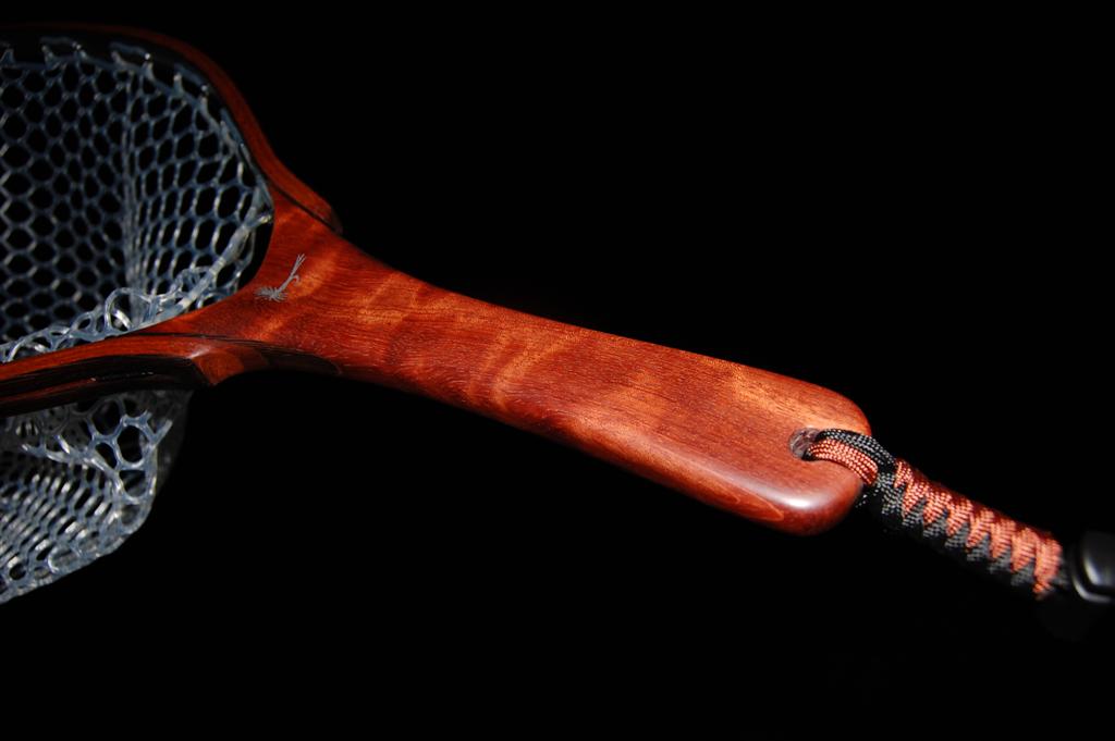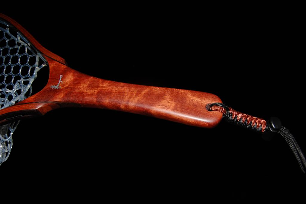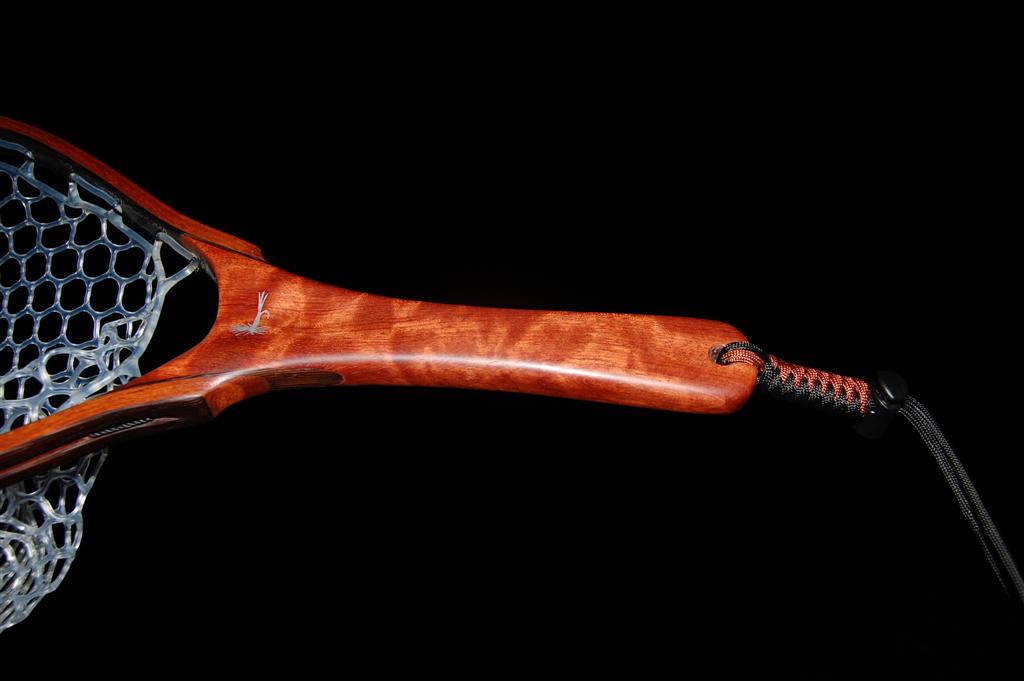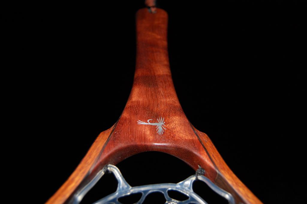 This fantastically colored net is mmade from hhighly figured bubinga. This causes refractive shifts in the coloration of the handle when it is held at different angles to the eye. The hoop is Wenge & Genuine Mahogany. It was a Christmas gift from a father to his business partner. The partners's initials are engraved onto the handle butt, and an aluminum Adams fly is engraved in the handle. This net also includes an integrated magnetic catch made from the same figured Bubinga & Wenge. It sports a stainless steel clip to attach to your vest.