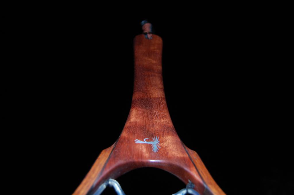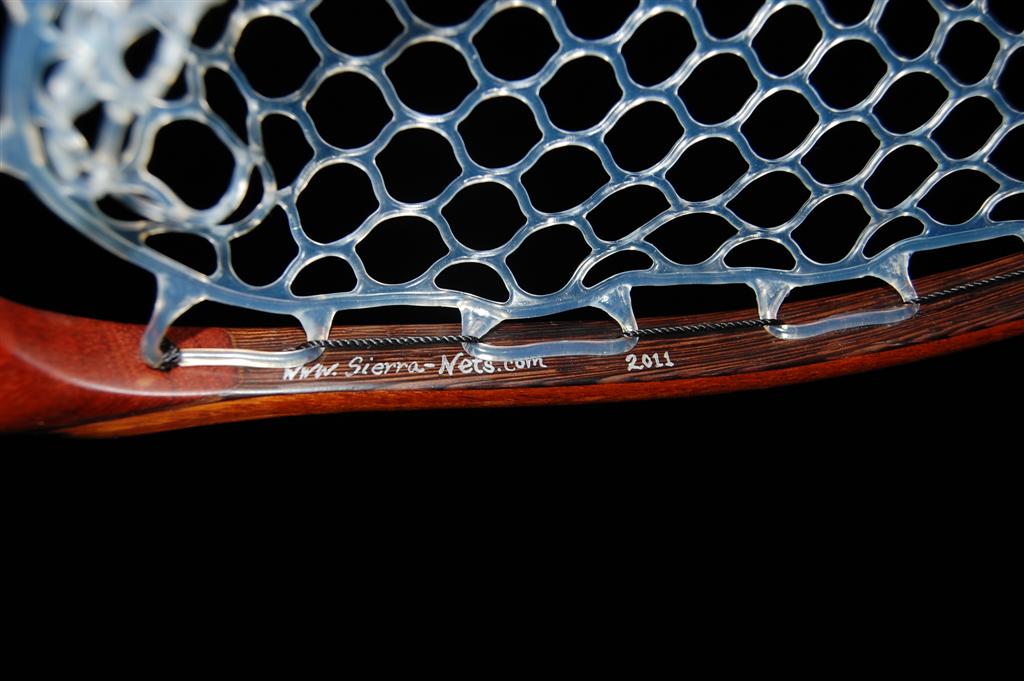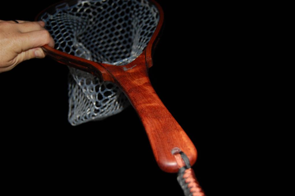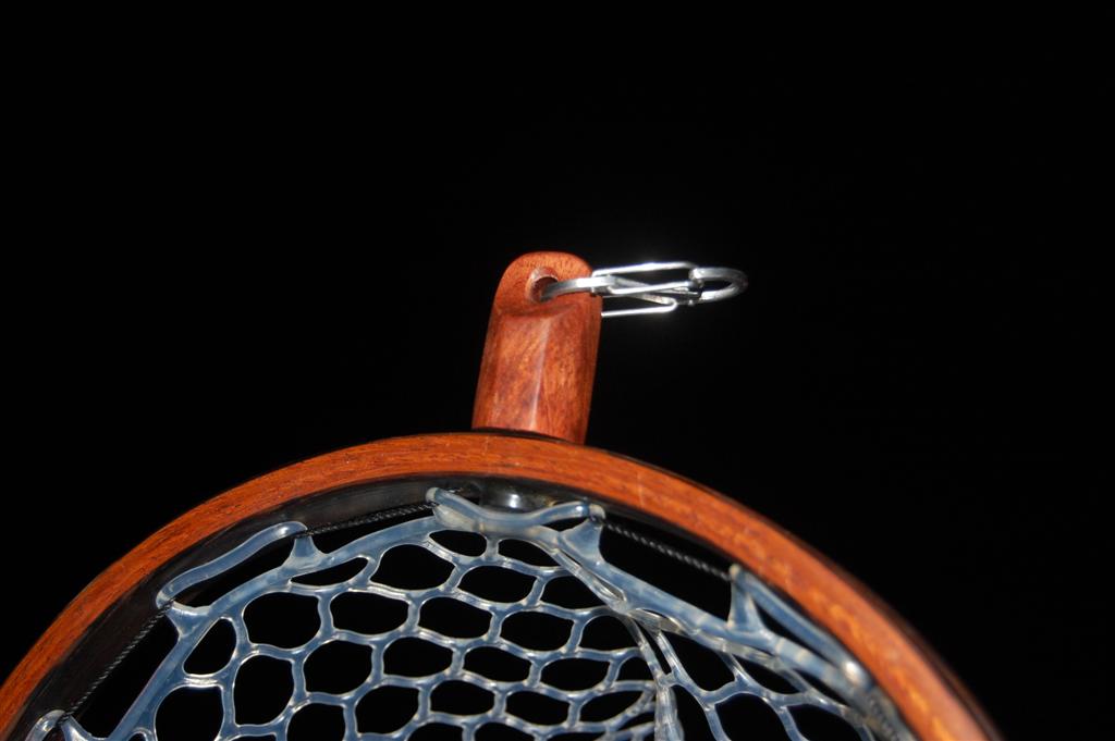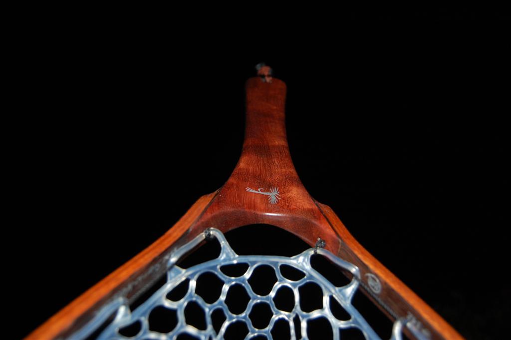 This fantastically colored net is mmade from hhighly figured bubinga. This causes refractive shifts in the coloration of the handle when it is held at different angles to the eye. The hoop is Wenge & Genuine Mahogany. It was a Christmas gift from a father to his business partner. The partners's initials are engraved onto the handle butt, and an aluminum Adams fly is engraved in the handle. This net also includes an integrated magnetic catch made from the same figured Bubinga & Wenge. It sports a stainless steel clip to attach to your vest.