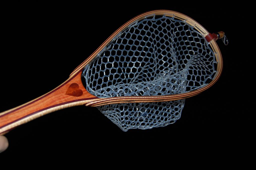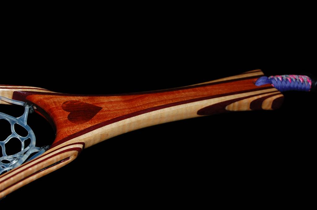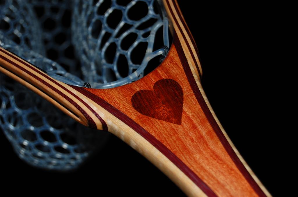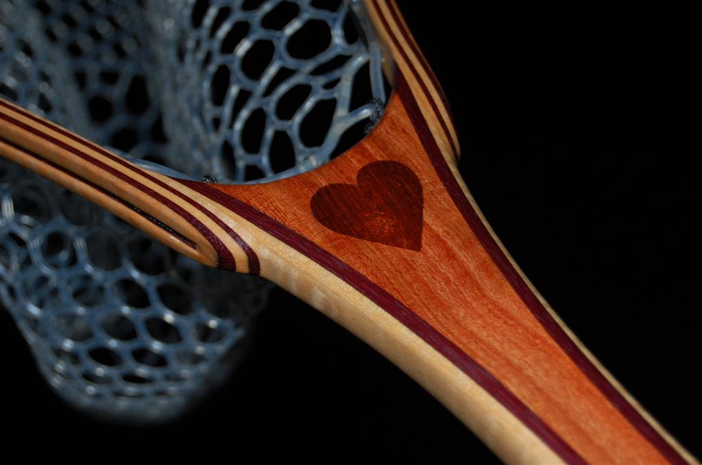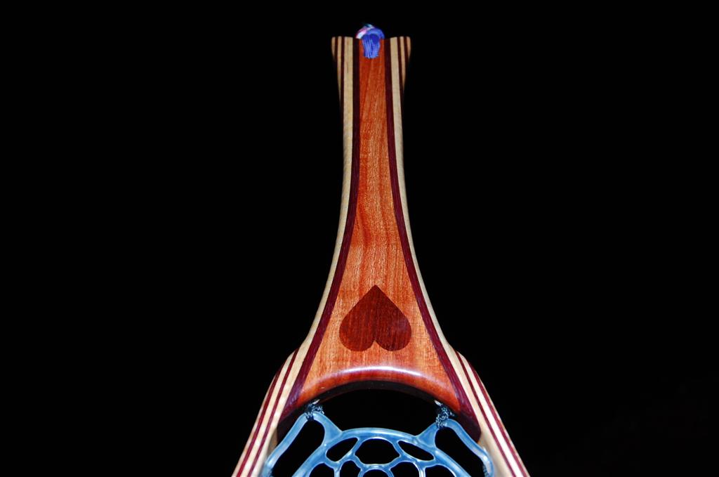 This net is made from a repurposed piece of urban Carob firewood. The heart is inlaid into the Carob using Bloodwood. The hoop is Purpleheart & Curly Maple. The Latigo Leather Magnetic Net Release is made of Maple Burl. This net was bought by an avid fly fisherman for his fly fisherwoman. The hand-tied Lanyard was selected to make a bold statement. The Purple Heart does just that!