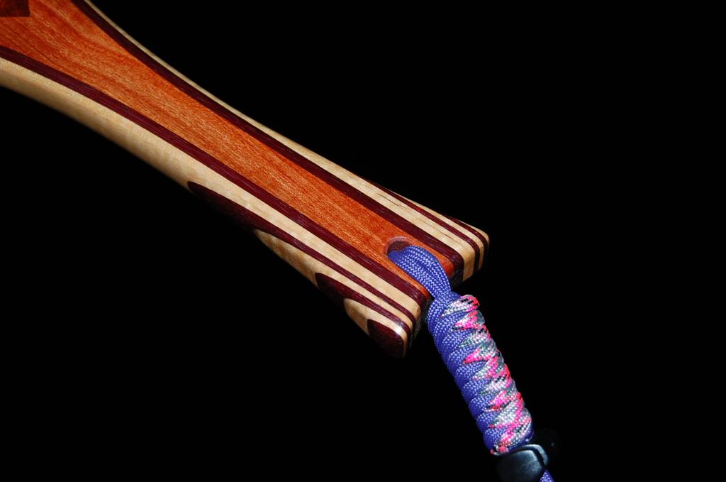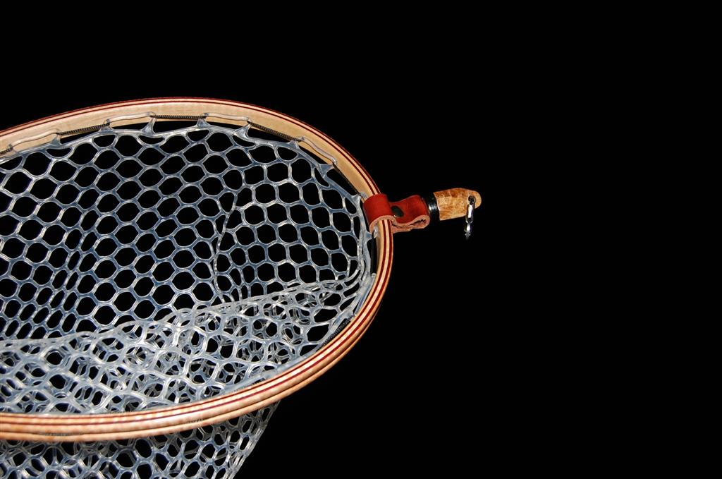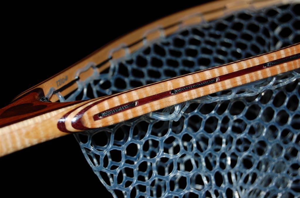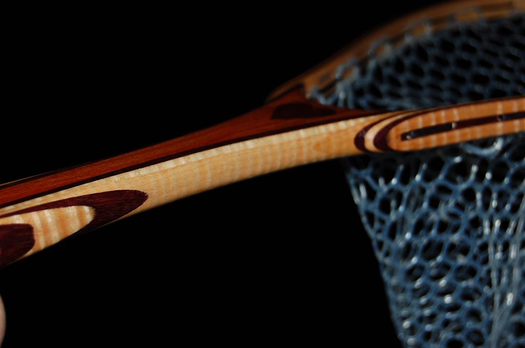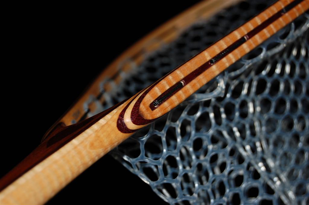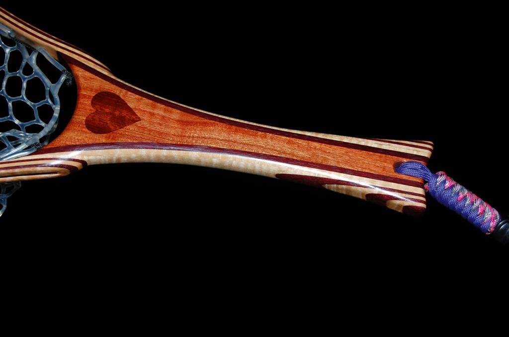 This net is made from a repurposed piece of urban Carob firewood. The heart is inlaid into the Carob using Bloodwood. The hoop is Purpleheart & Curly Maple. The Latigo Leather Magnetic Net Release is made of Maple Burl. This net was bought by an avid fly fisherman for his fly fisherwoman. The hand-tied Lanyard was selected to make a bold statement. The Purple Heart does just that!