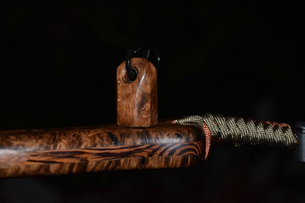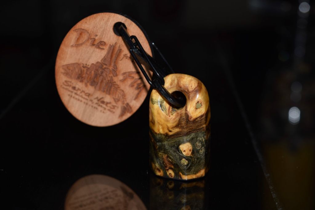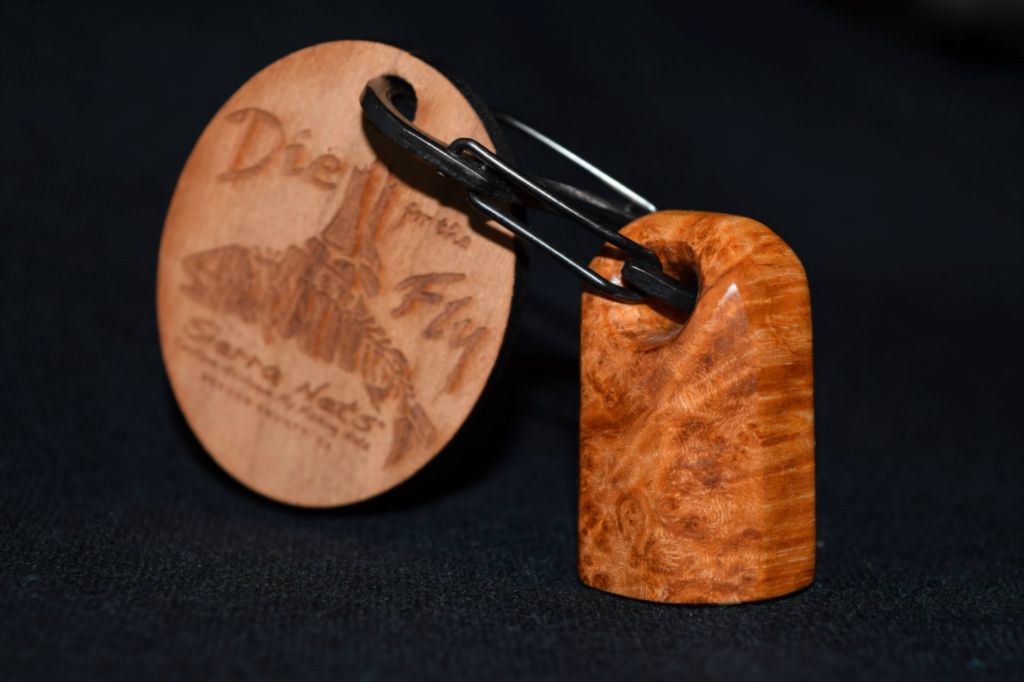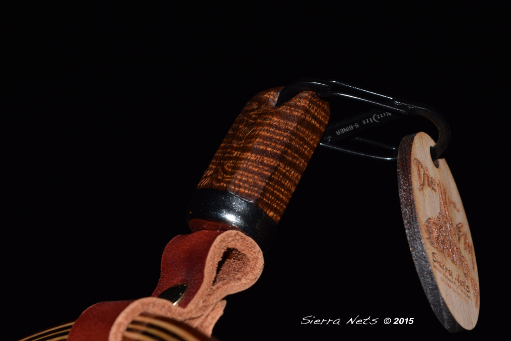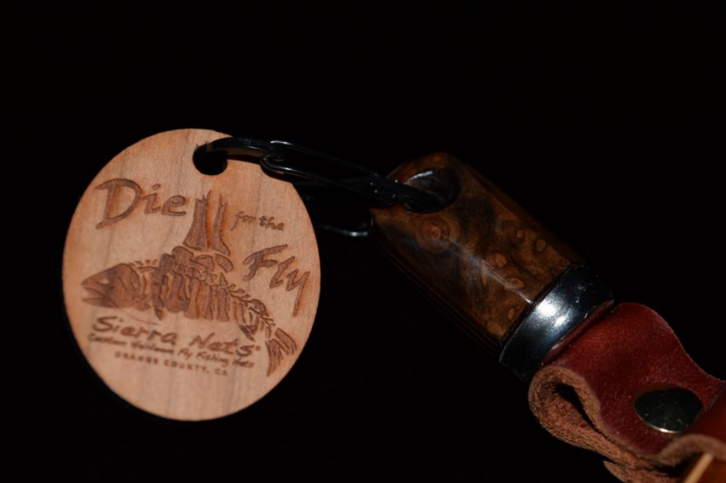 This is a fitting magnetic net release to compliment your new custom Sierra Net. It is made of durable yet plush Latigo leather available in either brown or mahogany. The magnet is affixed with a solid copper rivet and a solid brass Chicago bolt which attaches the leather strap to your net. The vest side can be made of any wood species and is attached using a stainless steel carabiner. Custom leather magnetic net releases start at $85.00.